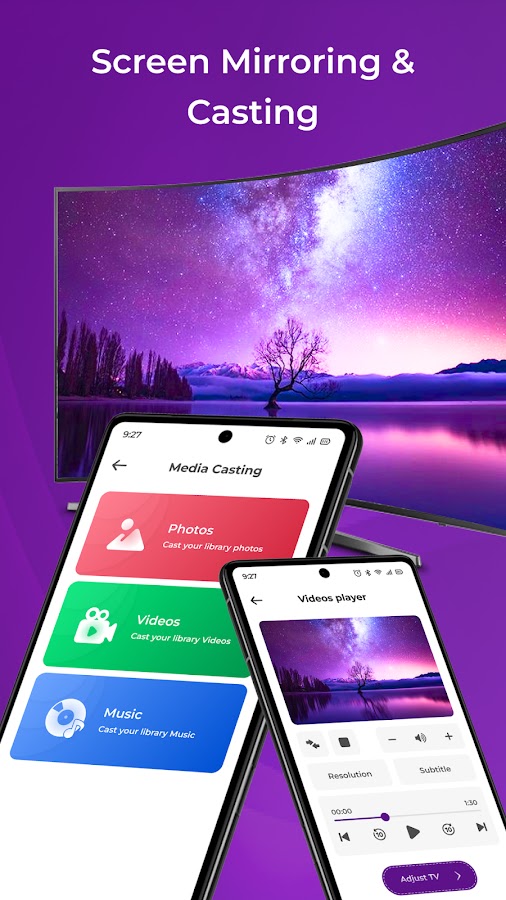 Приложение Roku Cast транслирует видео, музыку и фотографии на ваши устройства Roku. Передавайте локальные фотографии, музыку и видео со своего телефона или других медиасерверов на Smart TV, подключенный к Roku. Функциональность приложения Roku Remote, которое управляет вашим устройством Roku.