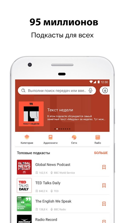 — Слушайте свои любимые подкасты или ищите новые на 70 разных языках.