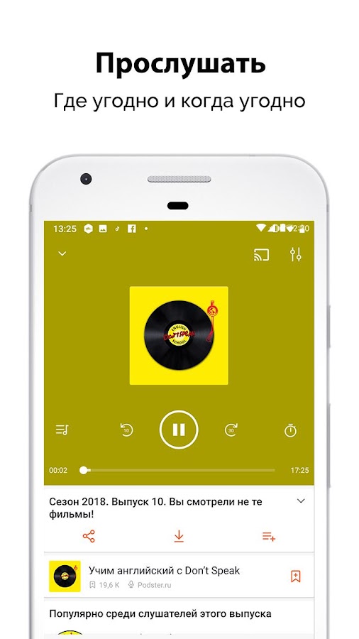 — Делитесь своими любимыми подкастами с друзьями через Facebook, Twitter, e-mail и т.д.