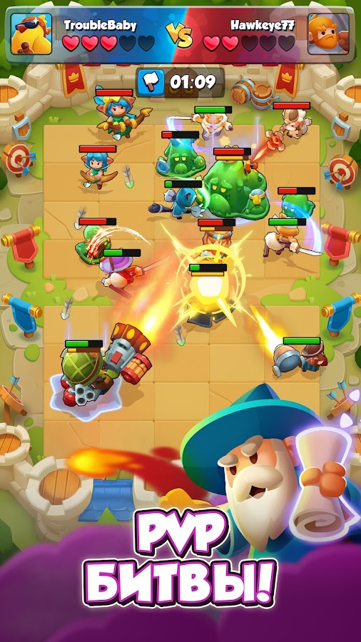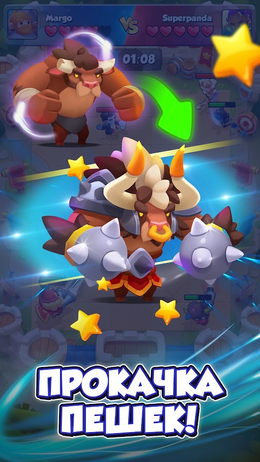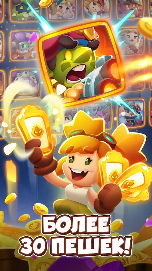 Собирайте армию могучих воинов, чтобы уничтожить противника и завоевать победу! Призывайте пешки, которые появляются в случайных клетках поля боя. В вашем распоряжении – множество замечательных бойцов: от милого на вид, но опасного Шибы до Пирата, Техника и даже Хищного Трюфеля! Каждая пешка относится к определённому типу, который определяет её роль в бою: например, пешки вида «Оборона» могут пережить серьёзный урон и помочь вам отбить атаку врага. Используйте разные типы, чтобы собрать сильную колоду. Копите Боевые бонусы и объединяйте пешки, чтобы сделать их сильнее, а в итоге получить Звёздный ранг!