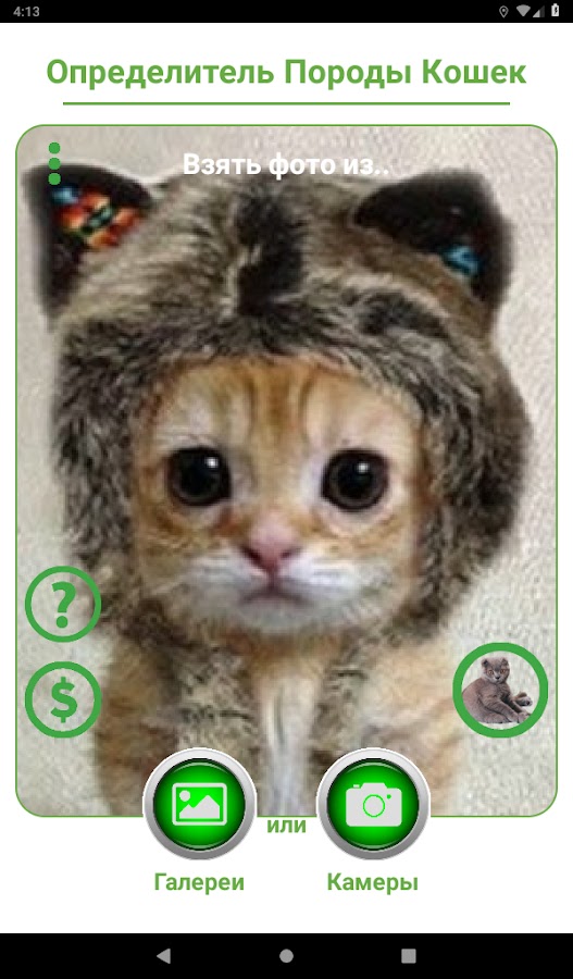 Определяет породу кошки по фотографии используя камеру вашего устройства или галерею изображений.