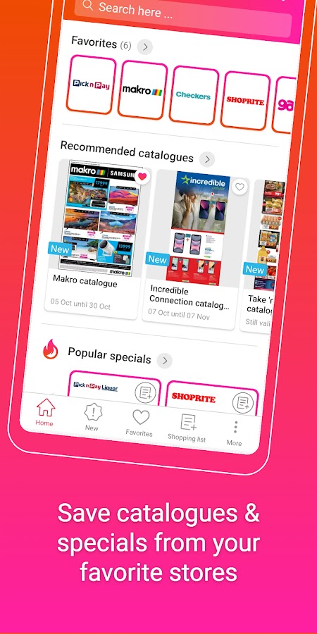 Благодаря этим специальным предложениям и скидкам у вас под рукой будут все актуальные брошюры и предложения от крупных и мелких розничных сетей Южной Африки. Супермаркеты, магазины товаров для дома, магазины электроники, магазины модной одежды, магазины игрушек, компьютерные магазины, аптеки и многие другие — здесь вы найдете все, что вам нужно. Представлены даже большинство местных магазинов. Нажав на значок сердечка, вы можете добавить магазин в избранное и всегда быть в курсе предложений любимых магазинов. Таким образом, ваши любимые брошюры всегда будут под рукой.