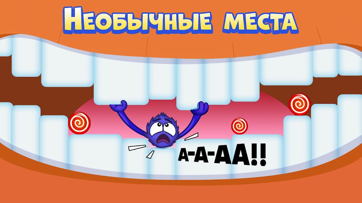 🎨 Красочная графика — яркие локации, множество конфет, хитрые препятствия и фиолетовый шарик, который не сдаётся.