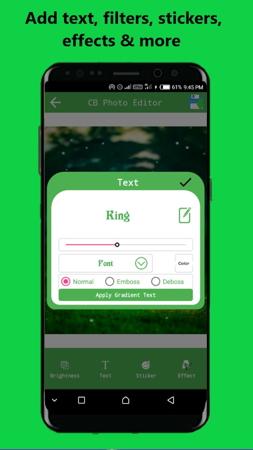 С помощью приложения CB Background Photo Editor вы можете редактировать, обрезать, изменять размер, изменять фон, добавлять эффекты, добавлять изображения в формате png и преобразовывать обычную фотографию в потрясающую фотографию. Продемонстрируйте свое творчество в редактировании с помощью приложения CB Background Photo Editor и удивите своих друзей, показав отредактированные фотографии.