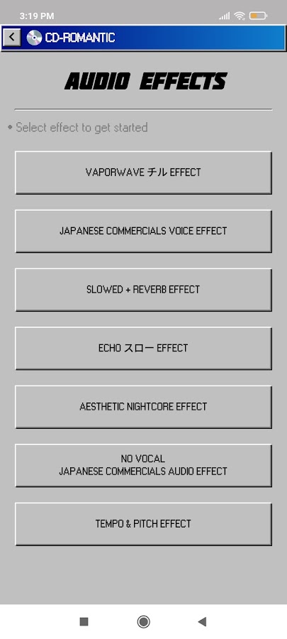 Приложение cd-romantic предлагает множество функций, предоставляющих вам беспрецедентный контроль над процессом создания музыки в стиле Vaporwave. Выбирайте музыку из различных источников: выберите музыку из списка музыки в приложении или вручную просмотрите приложение проводника файлов вашего устройства. Приложение оснащено 8 различными паровыми волнами и эстетическими музыкальными эффектами: