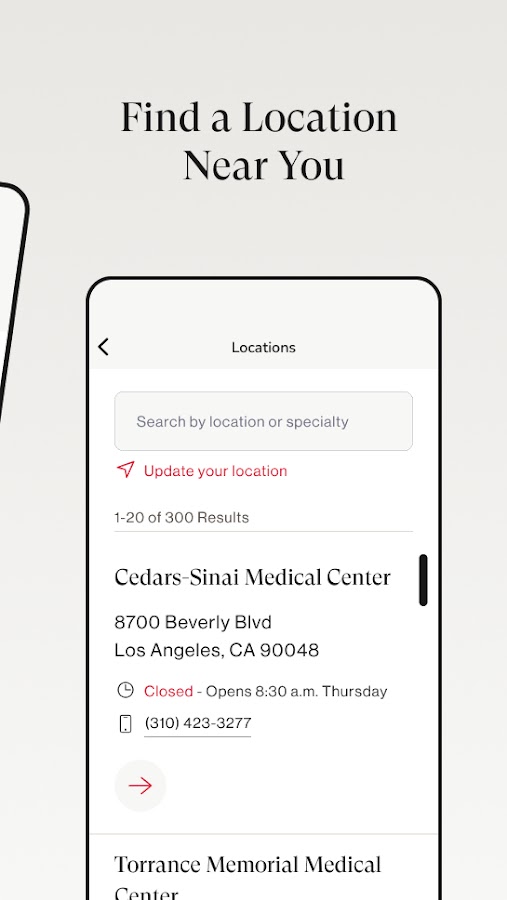 Получите маршрут до ближайшего пункта неотложной помощи, больницы или медицинского кабинета Cedars-Sinai. Хотите перекусить в больнице? Приложение поможет и в этом.