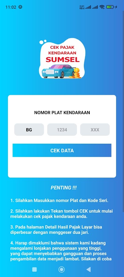 Это приложение было сделано, чтобы облегчить вам получение информации о налогах на транспортные средства для региона Южная Суматра. Это приложение может проверять только автомобили с номерными знаками Южной Суматры.