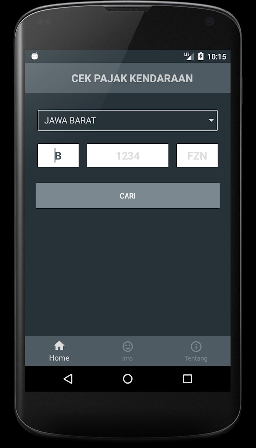 Это приложение, чтобы помочь проверить номера налоговой и автомобильной полиции. В настоящее время поддерживает Западную Яву, Восточную Яву, Джокьякарту, Западную Суматру, Южную Суматру, Риау, острова Риау, Западный Калимантан, Южный Сулавеси, Северный Сулавеси, Лампунг