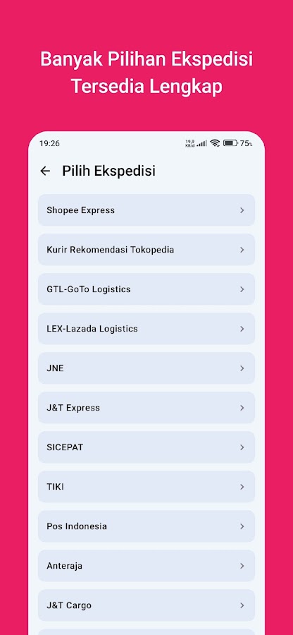 Поддерживаемые экспедиции для поиска квитанций или отслеживания посылок, такие как Shopee Express, JNE Express, J&T, POS Indonesia и многие другие популярные экспедиции или курьеры в Индонезии.
