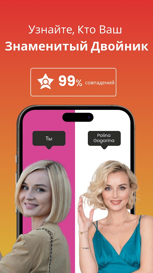 С приложением Star by Face всё просто: сделайте селфи или загрузите фото, и мощный AI найдет вашего двойника среди знаменитостей всего за несколько секунд!