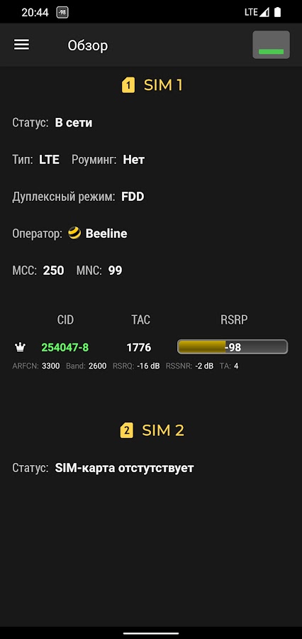• Уровень сигнала сотовой сети (RSSI для GSM и UMTS, RSRP для LTE)