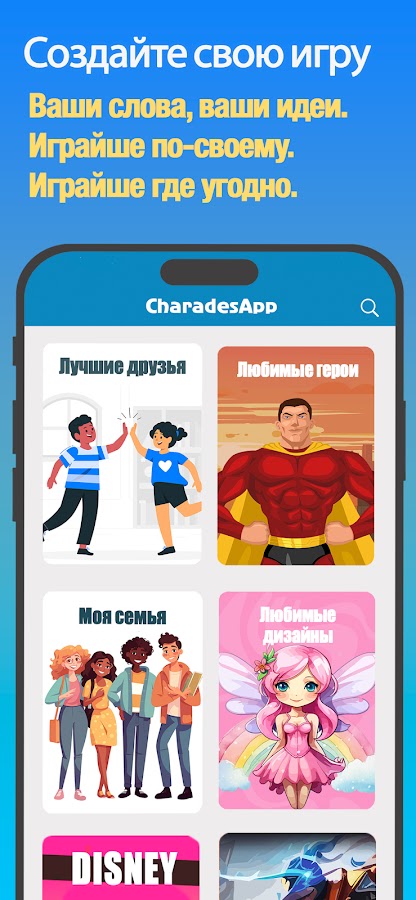 Играй с семьей, играй с друзьями! Выберите шараду из более чем 50 тем или создайте свою собственную шараду и играйте в CharadesApp (шарады) — угадайте игру в слова по-своему! 😂