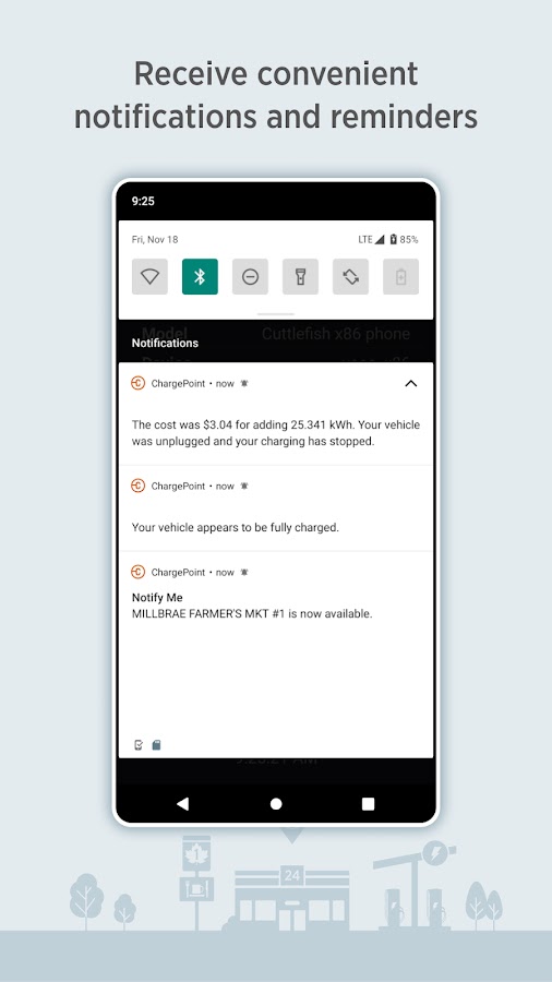 Получайте уведомления и напоминания в режиме реального времени о состоянии зарядки, в том числе о том, когда станция становится доступной, когда ваш автомобиль завершает зарядку, а также о стоимости сеанса зарядки.