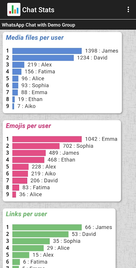 Чтобы получить статистику, просто экспортируйте индивидуальный или групповой чат из WhatsApp в это приложение «Статистика чата».