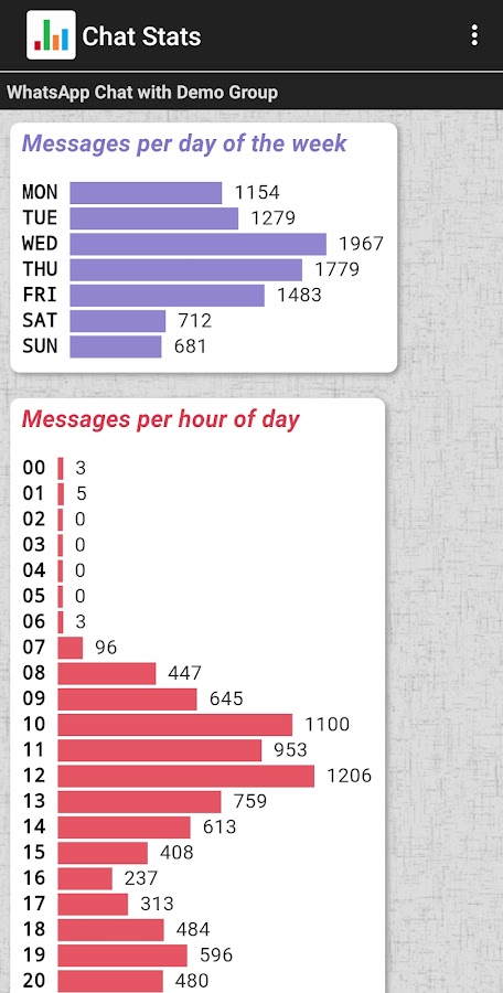 После анализа экспортированного чата это приложение отображает статистические данные с гистограммами .
