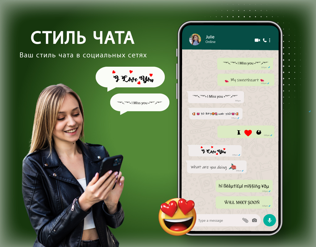Используйте стильный текстовый дизайн для своих текстовых сообщений с помощью приложения Stylish Chat Style Fonts. Приложение Chat Styles предлагает вам стильный генератор шрифтов — новый текстовый стиль. Стиль чата может быть как стилизован шрифтами, так и декорирован. Используйте стили чата в качестве трюка со шрифтами, чтобы создать потрясающий вид. С помощью стилей чата вы можете писать текст классными шрифтами и отправлять стильный текст. Общайтесь с друзьями, используя символы в стиле чата и очень классные шрифты. Используйте стильный текст необычным шрифтом для интересных новостей.