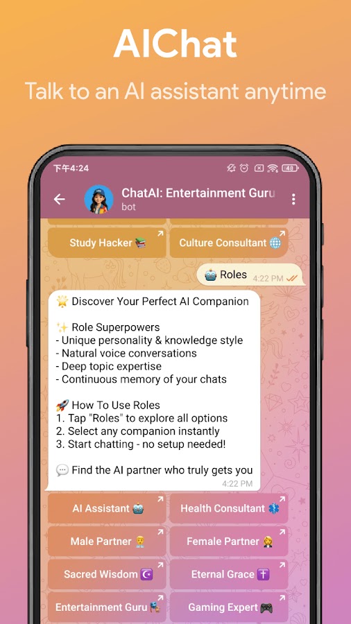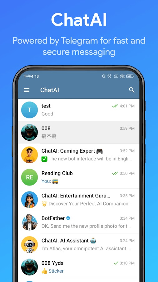 Скачайте приложение ChatAI: AI Chat for Telegram для Android бесплатно - последняя версия (0.0.86) уже доступна для установки на ваш телефон или планшет.