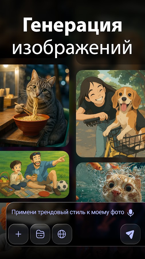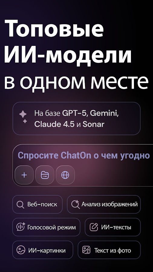Добро пожаловать в мир искусственного интеллекта! ChatOn — ваш незаменимый виртуальный помощник и собеседник, построенный на базе GPT-5, Gemini 2.5 Pro, GPT-4o, o4-mini, Sonar, Claude 3.7 и DeepSeek-R1. Готовитесь к важной презентации? Или ищете источник вдохновения и классные идеи? Наша нейросеть поможет вам решить эти и многие другие задачи.