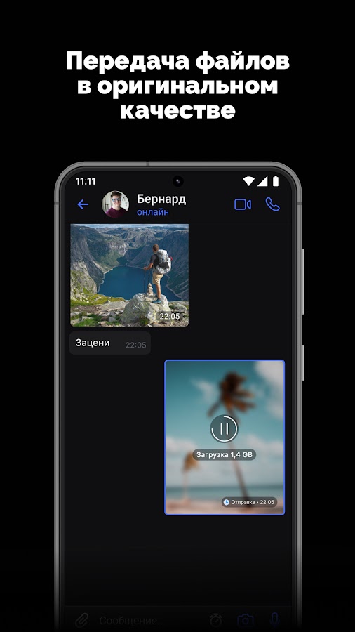 Отправляйте фотографии, видео, GIF, документы и другие файлы — все в оригинальном качестве.