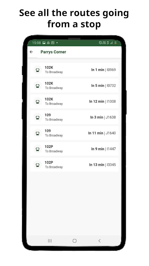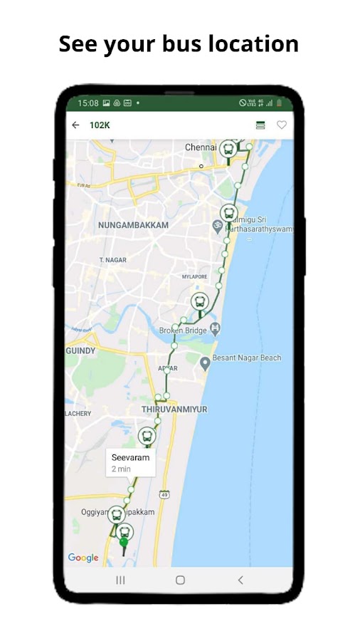 Наш собственный алгоритм в реальном времени обрабатывает миллионы точек данных для расчета времени прибытия вашего автобуса в реальном времени. Все, что вам нужно сделать, это нажать один раз на автобусной остановке, чтобы увидеть время прибытия вашего автобуса в реальном времени и соответственно спланировать, когда уйти :-)