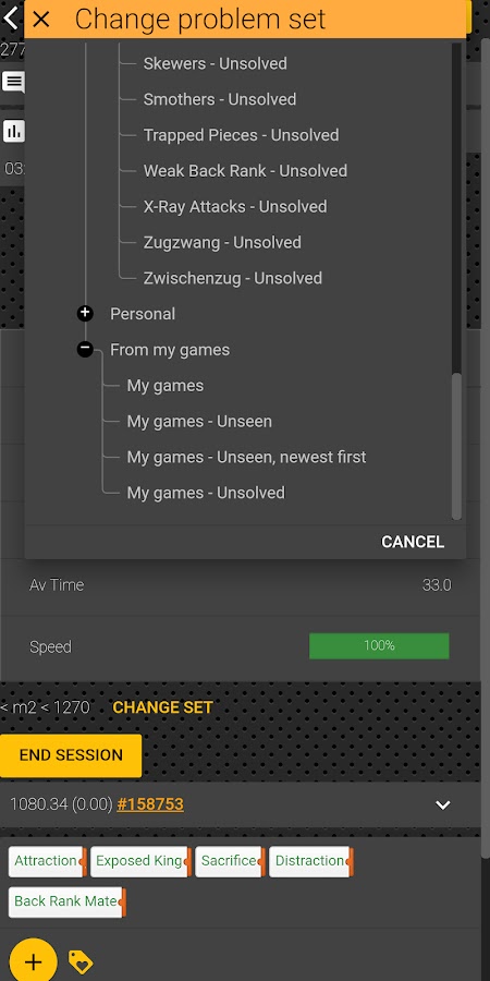 — Пользовательские наборы, которые могут быть нацелены на определенный тип окончаний, окончания, в которых вы постоянно ошибаетесь, или использовать интервальные повторения для обучения. Примечание: некоторые типы пользовательских наборов необходимо создать на веб-сайте Chesstempo перед использованием в приложении.