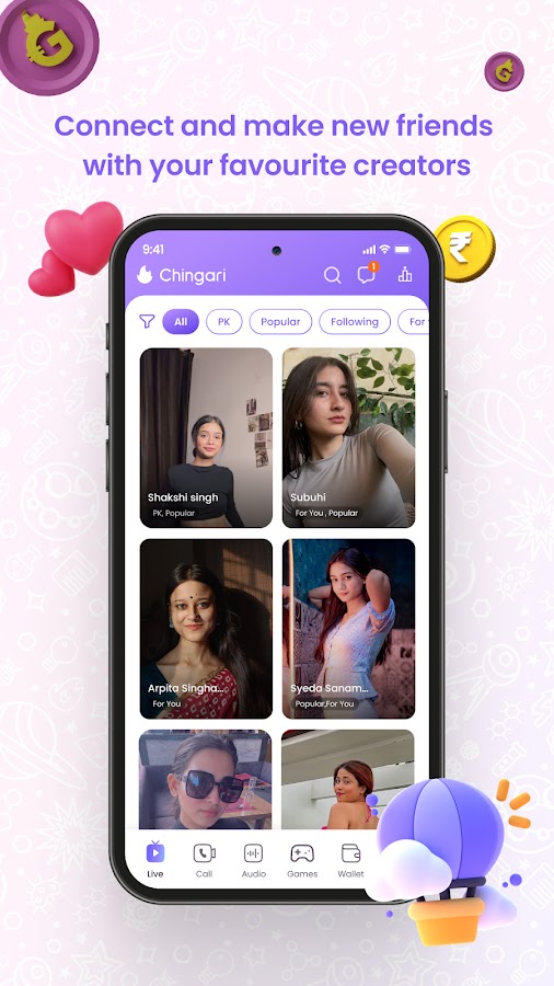 Chingari предлагает вам яркие прямые трансляции, интерактивные комнаты и захватывающие конкурсы — всё на одной платформе.