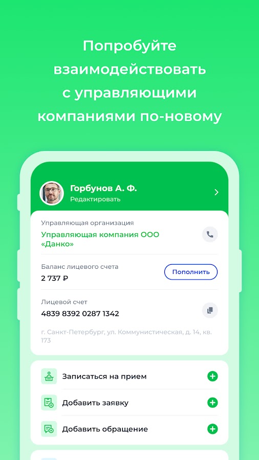 Никаких дополнительных трат и походов в офис, платите через приложение, передавайте показания счетчиков не выходя из дома.