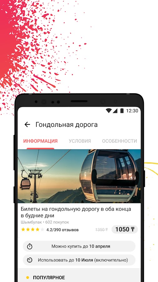На сайте более 600 акций на любой случай и для каждого! Покупай билеты онлайн, посещай лучшие развлечения и знаковые места: Медео и Чимбулак, Кок-Тобе, театр Лермонтова! Все скидки в одном месте и всегда с тобой!