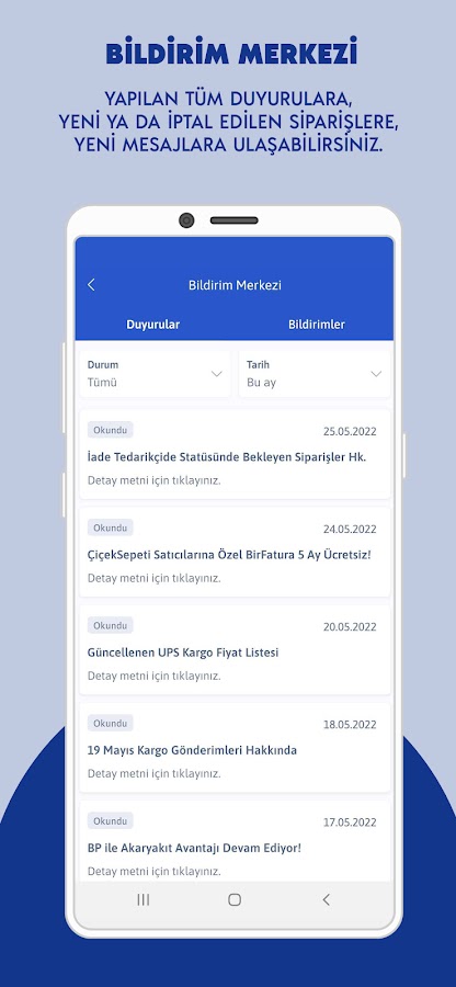 С мобильным приложением Çiçeksepeti Pazaryeri Seller Panel можно увидеть эффективность продаж, получить доступ к информации о продукте и продажах и отфильтровать их в соответствии с их статусом, а также легко определить транзакции маркетплейса, необходимые для принятия мер. и получите доступ к функциям, которые добавят преимущества вашему магазину Marketplace!