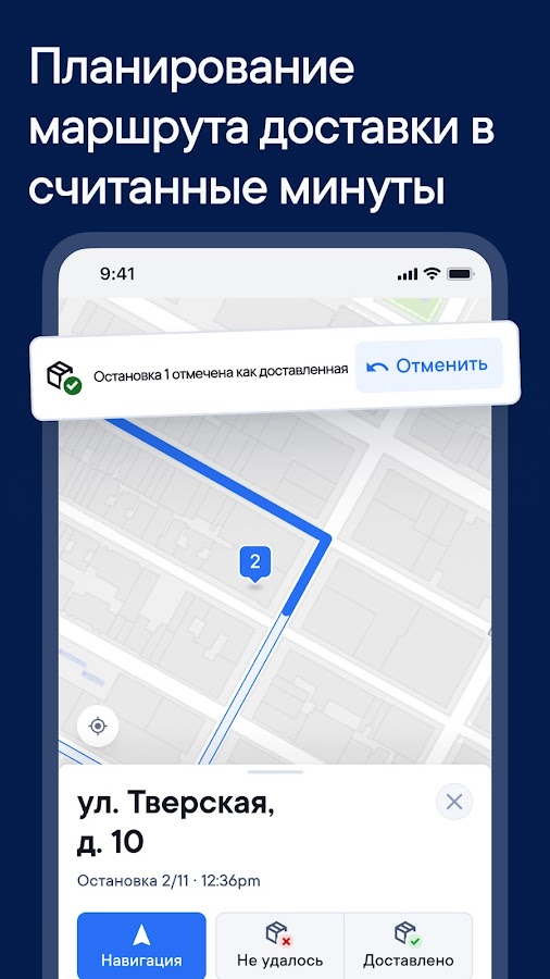 Мгновенное добавление остановок в маршрут. Простая оптимизация всех доставок и автоматическое планирование оптимальных маршрутов. Объезд заторов и быстрый поиск посылок повысят эффективность доставки.