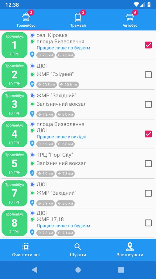 — Поиск маршрутов. Нужно лишь выбрать две точки на карте, полученные результаты можна отфильтровать и сразу применить для просмотра местонахождения нужного транспорта.