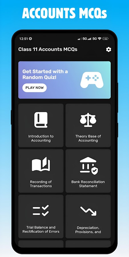 1. Привлекательный пользовательский интерфейс. Наслаждайтесь визуально привлекательным интерфейсом во время прохождения викторин Accounts MCQ.