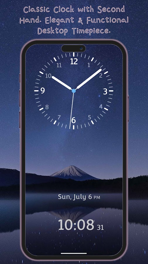 Приложение «Классические часы» привносит изысканный и традиционный стиль в ваш смартфон. Плавное движение секундной стрелки имитирует настоящий аналоговый механизм, создавая визуальное наслаждение. Идеально подходит для рабочего стола, прикроватной тумбочки или в качестве таймера для совещаний — всегда подчёркивает ваш утончённый вкус.