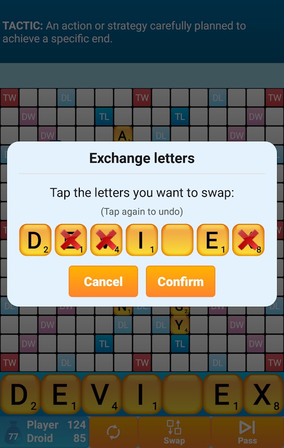 Выберите уровень мастерства компьютера (от новичка до эксперта), выберите список слов (английские списки слов включают последний список слов NASPA 2020) и используйте свои навыки стратегии и словарный запас, чтобы попытаться победить дроида.