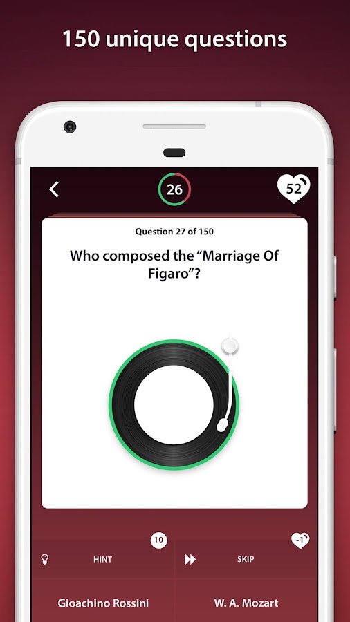 🎼🎻 🎹 🎼 Стань «Мини Моцартом», угадывая музыку, которую создали великие композиторы. Классическая музыка викторина — это новая игра, в которой ответы и вопросы для викторины содержат в себе игры викторины о классической музыке. Слушай наилучшие произведения классической музыки и расширь свои общие знания о величайших классических композиторах истории, таких как Бетховен, Бах, Моцарт, Вивальди и пр. Сможешь ли ты угадать композитора быстрее всех и получить наивысший балл? ИЗВЕСТНЫЕ КОМПОЗИТОРЫ И ИГРЫ ВИКТОРИНЫ ЖДУТ ТЕБЯ В ИГРЕ КЛАССИЧЕСКАЯ МУЗЫКА ВИКТОРИНА. ЗДЕСЬ ТОЛЬКО САМЫЕ ЛУЧШИЕ ВОПРОСЫ ДЛЯ ВИКТОРИНЫ!