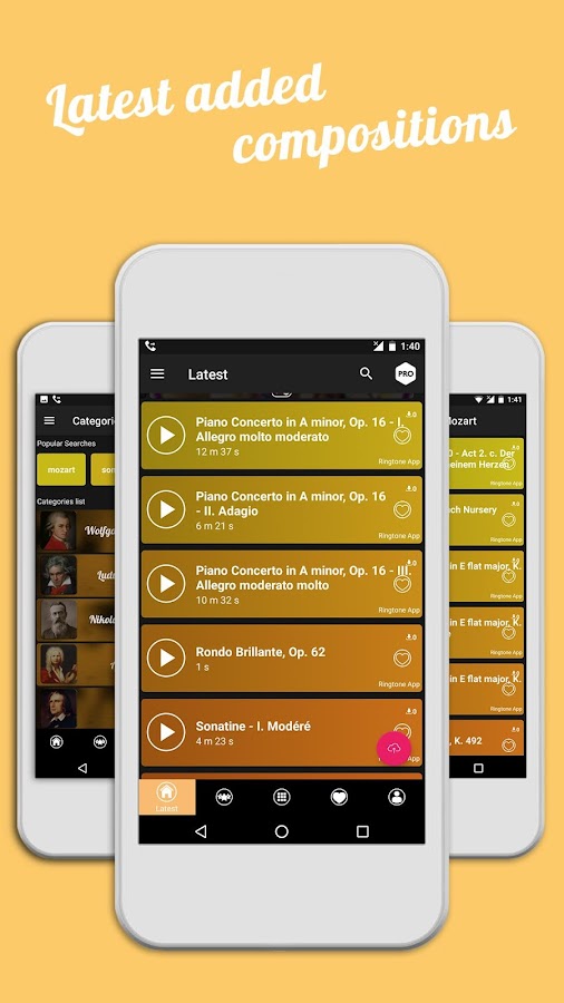 Большая коллекция классические мелодии вы будете иметь с Классическая Музыка Мелодии приложение. И все бесплатные мелодии велики. И они великолепно звучит в качестве рингтонов, но также, этот лучшие мелодии будет великолепно звучит, как звучит сигнал тревоги или, как мелодии сообщение. Установите специальный рингтон для вашего специального человека, сохранить любимые мелодии в список избранных или доли звуки, которые вам нравятся больше всего в социальных сетях, что вы хотите с самым лучшим приложением. Когда вы слышите, как только бесплатные рингтоны, что мы подготовили, вы не хотели бы, чтобы искать другие мелодии. Здесь есть все, что вы ищете. Лучший классическая музыка на телефоне и бесплатно.