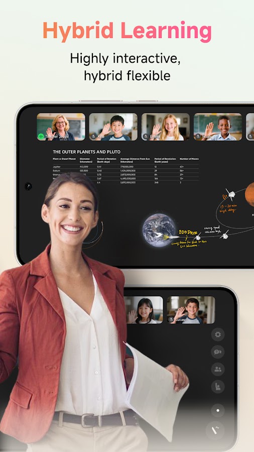 ClassIn широко известен своими комплексными решениями для онлайн- и офлайн-обучения. Он предлагает беспрепятственный доступ до 2000 человек для посещения онлайн-классов в прямом эфире с одновременным отображением аудио и видео 50 человек. Кроме того, он предоставляет множество функций, включая совместную доску, совместные документы, групповое обучение и виртуальные эксперименты, чтобы воспроизвести ощущение автономной среды. Благодаря современной интеллектуальной системе обучения ClassIn обеспечивает простое и эффективное обучение как онлайн, так и офлайн.
