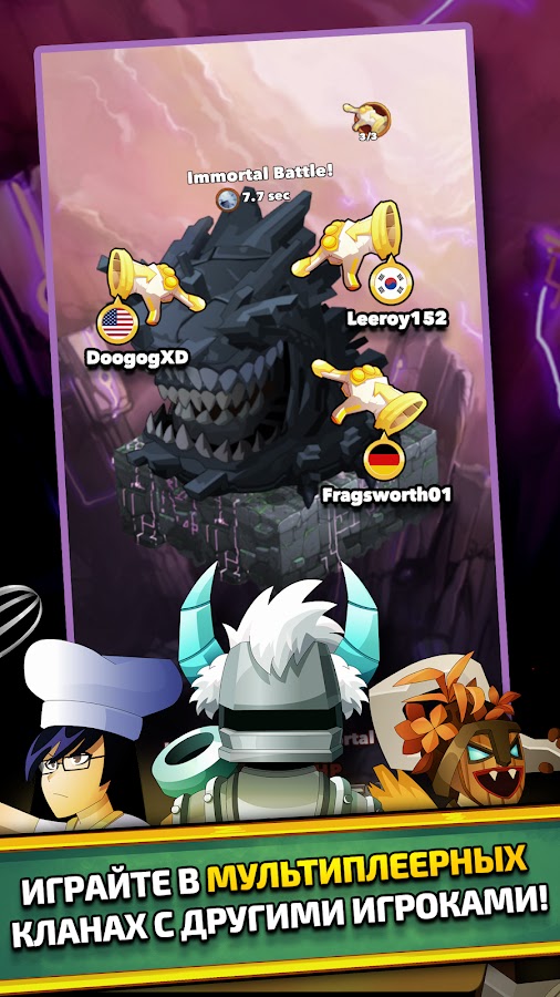 Одна из самых популярных игр на сервисе Steam теперь на вашем мобильном устройстве! Clicker Heroes — ленивая РПГ, положившая начало жанру! Погрузитесь в удивительный мир простых, но невероятных приключений. Сразитесь с монстрами, нанимайте и улучшайте героев. Добывайте золото и другие сокровища. Откройте для себя абсолютно новый мир! Новая система кланов и Бессмертных! Объединяйтесь с другими игроками и участвуйте в рейдах! Сразитесь с особым типом монстров — бессмертными!