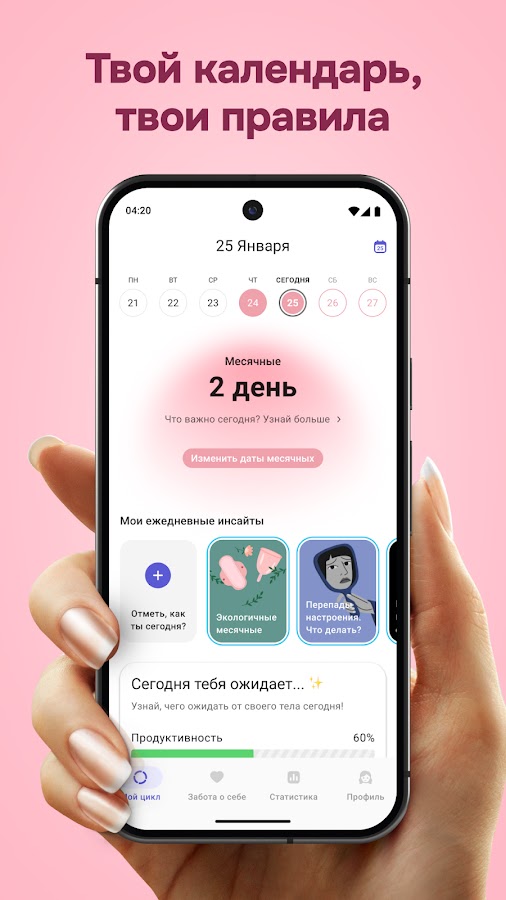 Скачай приложение «Женский календарь месячных», и ты получишь не только менструальный календарь, но и удобный способ контролировать овуляцию и зачатие. Женский календарь месячных поможет тебе и в том случае, если рождение ребёнка пока не входит в твои планы и ты используюшь контрацепцию, чтобы не забеременеть. Приложение подходит для женщин всех возрастов, включая подростков, которые только начинают отслеживать свои первые циклы. Это также полезно для тех, кто хочет отмечать все изменения в своем женском здоровье и отслеживать критические дни.