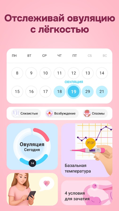 С нашим менструальным календарем для женщин и девочек тебе будет просто отслеживать и предупреждать месячные, планировать беременность и определять идеальный день для зачатия ребенка. Ты легко сможешь настроить свой индивидуальный женский календарь месячных и овуляции, который будет учитывать особенности твоего тела и не позволит ПМС помешать твоей активной жизни. Это особенно важно для женщин и девушек, которые ведут активный образ жизни и хотят быть в курсе всех изменений своего женского здоровья.