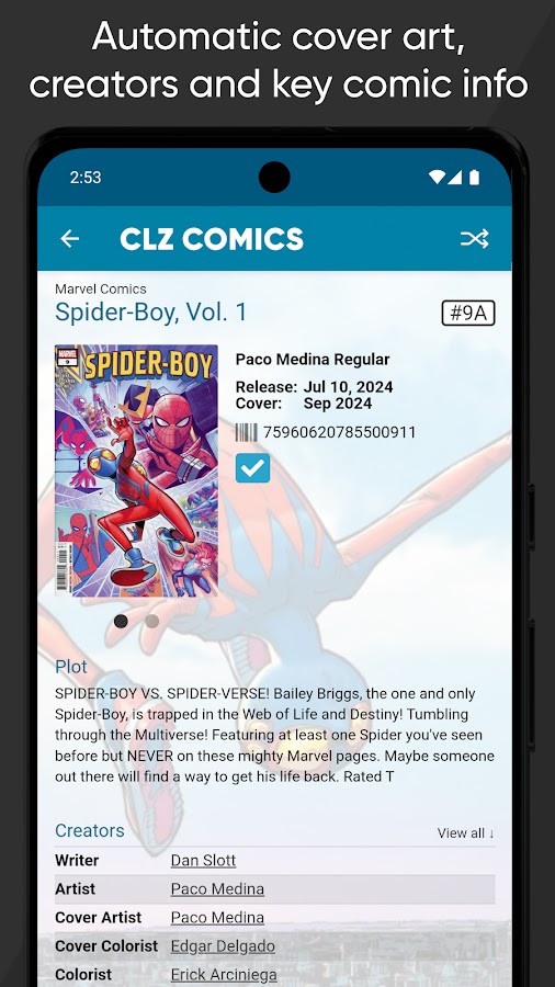 Легко каталогизируйте свою коллекцию комиксов. Чтобы добавить комиксы в приложение, просто отсканируйте обложку камерой вашего устройства. Приложение распознает комикс и автоматически предоставит подробную информацию о выпуске, обложку, список авторов и многое другое.