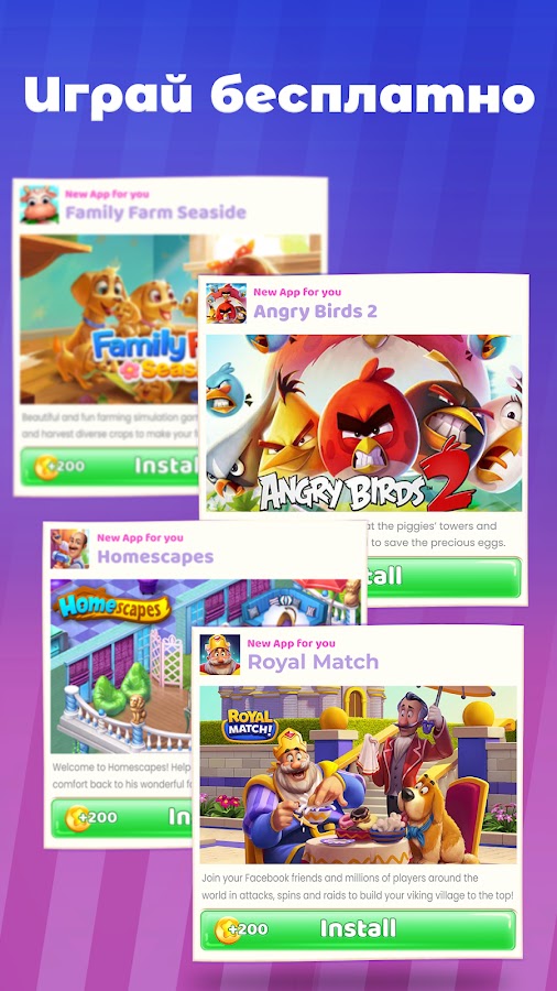 Самое захватывающее в нашем приложении – это то, что ты сможешь получить свою первую подарочную карту или денежное вознаграждение уже через несколько часов, которые ты проведешь в любой из выбранных тобой игр!