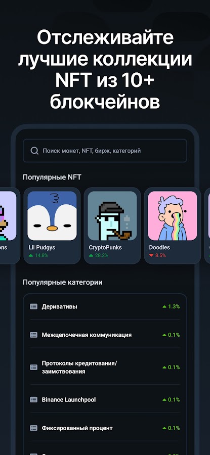 Отслеживать промышленные секторы, такие как децентрализованные финансы (DeFi), невзаимозаменяемые токены (NFT), токены децентрализованной биржи (DEX), токены на основе биржи, игры/игры для заработка и более 50 основных категорий.