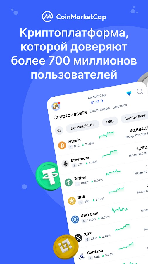 CoinMarketCap – это бесплатное приложение для отслеживания криптовалюта, которое позволяет вам: