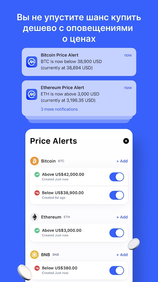 Получайте оповещения при изменении ключевых показателей выбранных вами криптовалюта или всего вашего портфеля. Настройте порог цены (в предпочитаемой криптовалюте) и вы будете уведомления когда цена оказывается выше или ниже него.