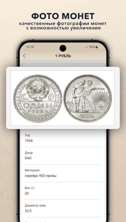 Качественные фотографии: Просматривайте монеты в высоком разрешении и увеличивайте изображение для детального изучения каждой детали.