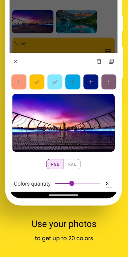 • Изображение: Превратите свои любимые фотографии в красивые палитры, извлекая цвета прямо из изображения с помощью продвинутых методов квантования.