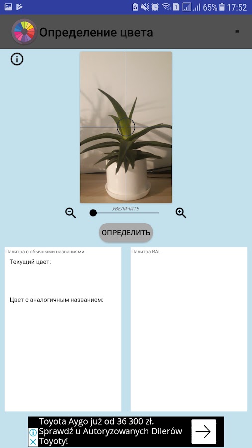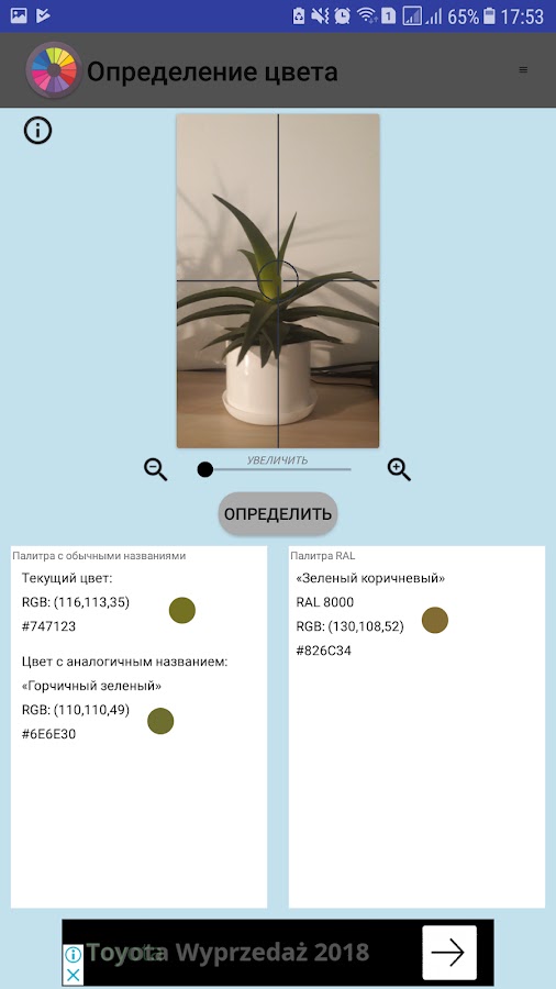 Определение цвета — простое приложение для определения названий цветов. Приложение позволяет определить код цвета выбранной области в HTML (CSS), RGB и RAL.