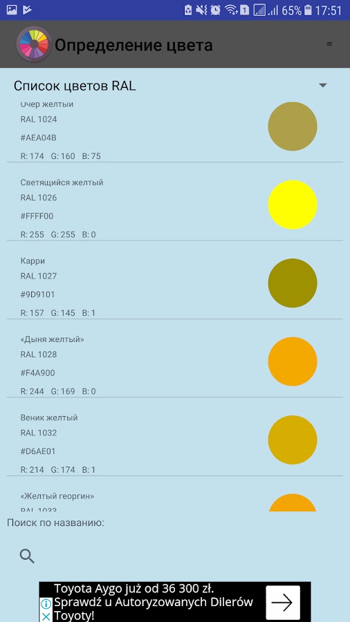 Приложение «Определение цвета» также позволяет находить название цвета. Кроме того, в приложении предусмотрен список цветов (более 1500) для поиска по названию цвета.