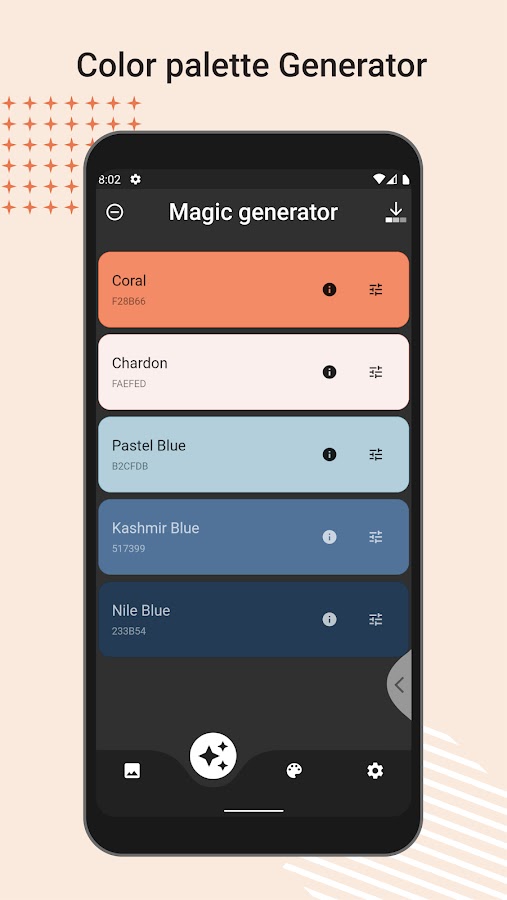 С легкостью сохраняйте, делитесь, дублируйте, удаляйте и редактируйте уже сохраненные палитры. Приложение поддерживает наиболее распространенные цветовые модели: RGB, HEX, LAB, HSV, HSL, CMYK и другие.